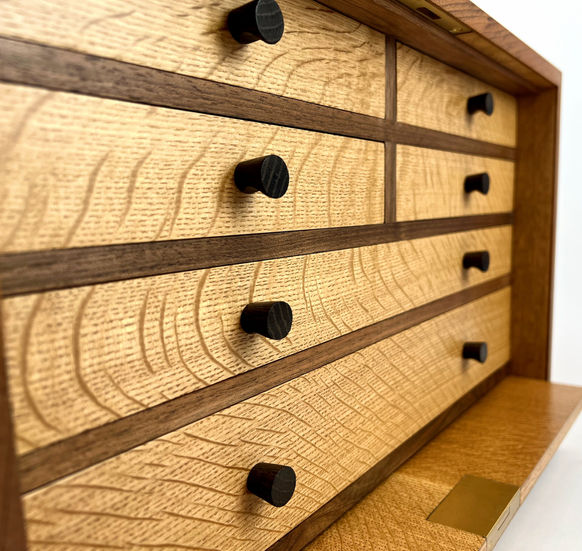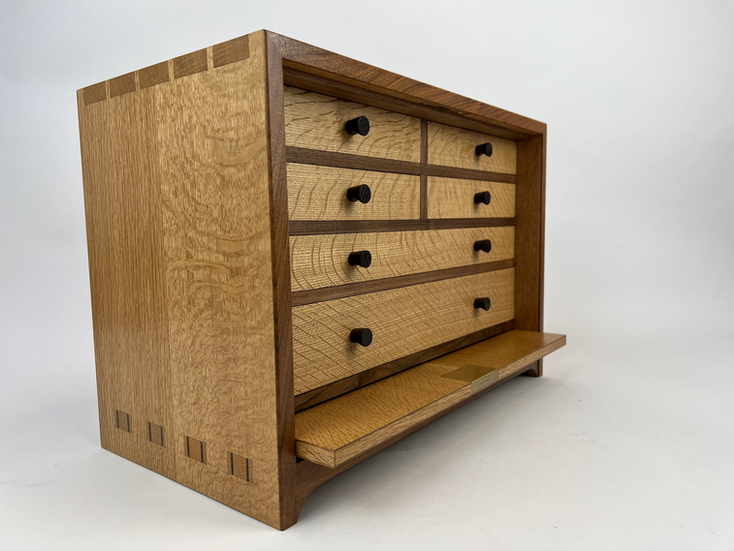 A very special cabinet specially made for a toolmaker's retirement. Every toolmaker will have owned one of these from their apprenticeship days, and this one was made from some amazing figured English oak. This project was a chance to incorporate some traditional craftsmanship, including hand cut dovetails and decorative wedged mortice and tenons.
