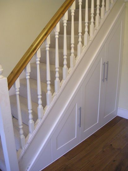 These cupboards are a great way of making the most of the often under used space below a staircase. 200kg runners are used for the pull out sections, ensuring strength, and longevity.